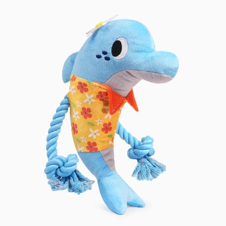 Een dolfijn van pluche met armen van touw.